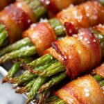 Bacon Wrapped Green Beans is a delicious side dish featuring fresh green beans bundled in crispy bacon, brushed with a buttery garlic brown sugar glaze, and roasted to perfection. This easy-to-make recipe combines savory and slightly sweet flavors, perfect for dinner accompaniments.