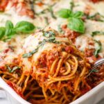Start by boiling your pasta in salted water but stop about a minute before it’s completely al dente. This is key because the pasta will finish cooking in the oven and you don’t want mushy strands. As soon as it’s done, drain and rinse the spaghetti with cold water to halt cooking and prevent sticking – trust me, this little trick saves you from a gummy bake.
