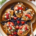 - Finish with berries and feta: Top the chicken with blueberries, diced strawberries, and crumbled feta cheese. Remove from heat.