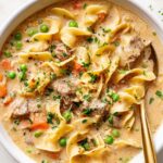 Hearty and comforting Beef Noodle Soup featuring tender top sirloin steak simmered with a flavorful blend of vegetables, herbs, and a creamy broth, served over perfectly cooked egg noodles. This recipe combines oven-baked rich beef with aromatic vegetables and a touch of creaminess for a satisfying meal perfect for cooler days.