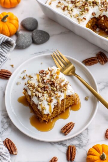 Pumpkin Poke Cake with Caramel, Cream Cheese Frosting, and Pecans Recipe