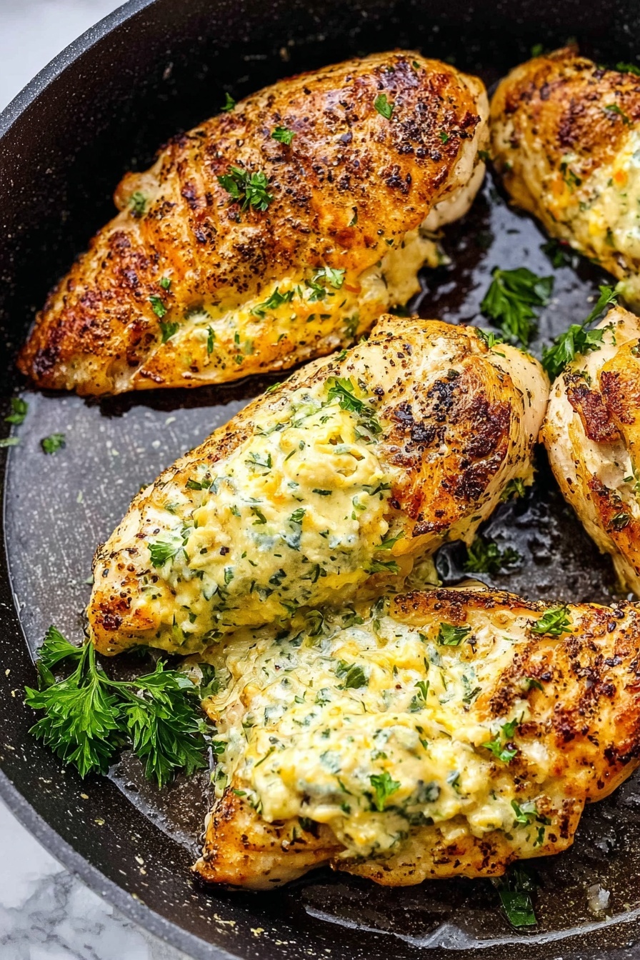 Transfer the skillet to your preheated oven and bake the chicken for 25 minutes. You’re aiming for cooked-through chicken with hot, bubbly filling. Use a meat thermometer to check the internal temperature reaches 165°F (74°C) for safe and juicy results.