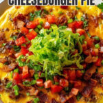 A savory and satisfying cheeseburger pie featuring crispy bacon, lean ground beef, cheddar cheese, and a fluffy biscuit batter, baked to golden perfection and topped with fresh burger toppings for a delicious twist on a classic favorite.