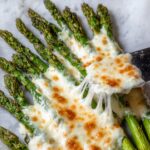 Mozzarella is perfect because it melts evenly and becomes gooey and stretchy without overpowering the asparagus flavor. Parmesan or a mix of cheeses can also be used for different tastes and textures.