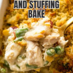 A comforting Chicken and Stuffing Casserole made with creamy chicken soup, sour cream, mixed vegetables, and a crispy stuffing topping. Perfect for a hearty family dinner.