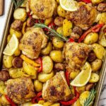 - Combine and Roast: Transfer seared chicken, browned sausage, and sauce to the baking sheet with the roasted potatoes, spreading evenly. Return to the oven and roast for 25 minutes, or until chicken reaches an internal temperature of 165°F and sauce has thickened slightly.