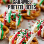 Delightful Christmas Caramel Pretzel Bites featuring mini pretzels topped with soft caramel and drizzled with festive red, green, and white candy melts, garnished with holiday sprinkles. A perfect sweet and salty holiday treat.