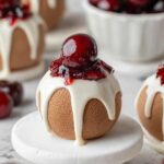 - Decorate: When chocolate coating is firm, add about ½ teaspoon of melted white chocolate on top of each truffle, then place a halved glacé cherry on each.