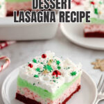 This festive Christmas Lasagna Dessert features a red velvet cookie-like base topped with a creamy peppermint cream cheese layer, vibrant green vanilla pudding, and whipped topping adorned with holiday sprinkles. Perfect for holiday gatherings, this no-bake layered treat combines classic seasonal flavors in a colorful, fun presentation.