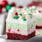 This festive Christmas Lasagna Dessert features a red velvet cookie-like base topped with a creamy peppermint cream cheese layer, vibrant green vanilla pudding, and whipped topping adorned with holiday sprinkles. Perfect for holiday gatherings, this no-bake layered treat combines classic seasonal flavors in a colorful, fun presentation.