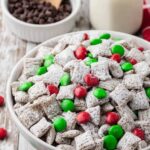Christmas Puppy Chow is a festive and delicious snack mix featuring chocolate, peanut butter, and crunchy rice Chex cereal coated in confectioners sugar and sprinkled with holiday M&M’s. Perfect for holiday parties or a sweet treat any time during the season.
