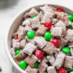 Reindeer Food is a festive and delicious holiday snack mix combining crunchy Chex cereal with a smooth chocolate, peanut butter coating, dusted with powdered sugar and studded with mini peanut butter cups and colorful M&M’s. Perfect for holiday parties and gifting.