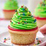 Delight in these festive Christmas Tree Cupcakes, featuring moist vanilla cake topped with green buttercream frosting shaped like a whimsical Christmas tree, decorated with colorful sprinkles, Twizzler candy strings, and a star topper perfect for holiday celebrations.