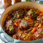 Coq au Vin is a classic French dish featuring tender chicken thighs braised in a rich red wine sauce with bacon, mushrooms, and aromatic herbs. This comforting and flavorful one-pot meal is perfect for a special dinner or gathering, delivering deep, savory flavors with a luscious sauce.