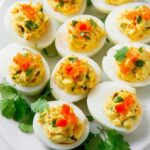 - Garnish and serve: Sprinkle finely grated carrots and thinly sliced green onions over the filled eggs. Serve immediately or refrigerate in an airtight container until ready to serve.