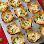 - If you lack a 24-count mini muffin tin, use a regular 12-count muffin tin placing two wonton wrappers per cup offsetting corners to avoid overlap. Use 2 tablespoons of filling per cup to make 12 larger cups.