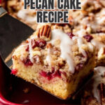 I’ve brought this cake to holiday gatherings served on a pretty platter, topped with extra toasted pecans and fresh cranberries for a festive touch. You can also cut it into squares and serve with small dollops of cream cheese frosting for a fun twist.
