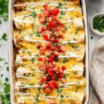 - Add Sauce and Cheese: Pour the remaining cream cheese sauce evenly over the rolled enchiladas. Sprinkle the remaining shredded cheese over the top.