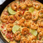 - Combine Shrimp and Final Touches: Add cooked shrimp and peppers back into the sauce. Stir to combine. Add fresh lime wedges to the skillet, remove from heat, and garnish with fresh chopped cilantro.