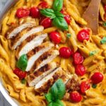 - Combine Pasta and Chicken: Add the drained pasta to the sauce and stir well to coat evenly. Add the sliced chicken strips and cook for an additional 2 minutes to heat through.