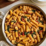 This Creamy Tomato Pesto Pasta with Chicken is a delightful Italian-inspired dish featuring al dente rigatoni tossed in a rich, creamy tomato pesto sauce with tender seared chicken, roasted red peppers, fresh spinach, and topped with creamy burrata cheese for an indulgent finish.