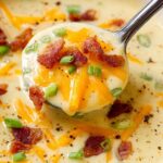 - Serve and garnish: Ladle soup into bowls and garnish with reserved bacon, cheese, and green onions.