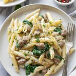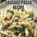 A rich and creamy sausage pasta recipe featuring browned Italian sausage, tender penne pasta, and a luscious sauce made with butter, garlic, heavy cream, and Parmesan cheese. Enhanced with fresh baby spinach for a touch of green and balanced flavor.