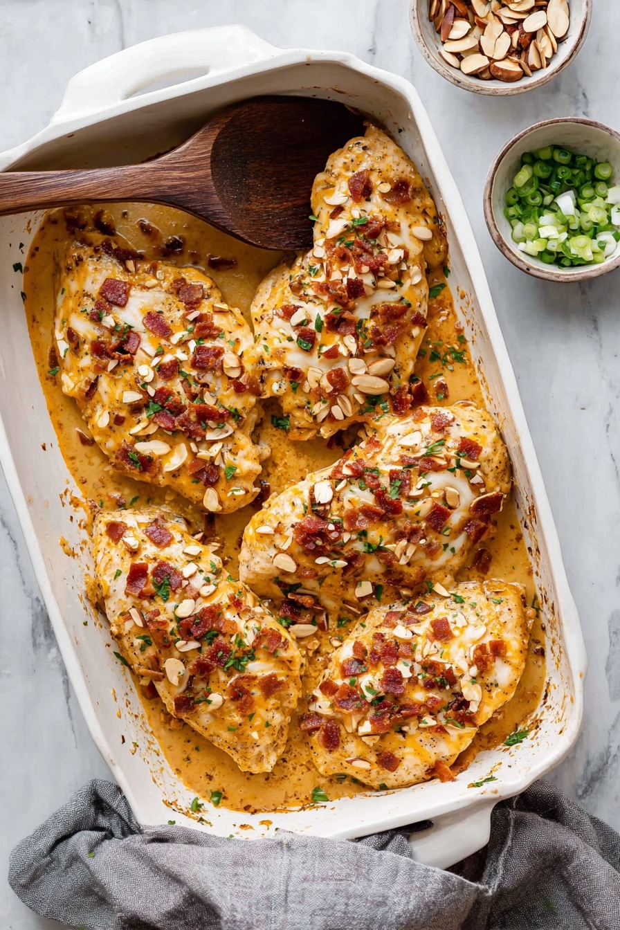 Million Dollar Chicken is a flavorful baked chicken dish topped with a creamy, cheesy mixture enhanced by crispy bacon and crunchy almonds. This recipe delivers juicy chicken breasts covered in a rich topping, perfect to serve alongside rice, pasta, or vegetables for a satisfying meal.