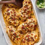 - Assemble and Bake: Place the seasoned chicken breasts into the prepared baking dish. Spread the cream cheese mixture evenly on top of each chicken breast.