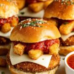 These Chicken Parmesan Sliders are a delicious twist on the classic Italian favorite, featuring breaded and pan-fried chicken topped with marinara sauce, provolone cheese, and melted mozzarella sticks, all nestled in buttery slider buns. Perfect for a crowd-pleasing appetizer or a fun main course, these sliders combine crispy chicken with gooey cheese and flavorful seasonings for a satisfying bite.