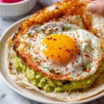 Crispy Feta Fried Eggs is a simple and flavorful breakfast recipe featuring a golden brown crust of sautéed feta cheese topped with a perfectly cooked fried egg. Served on a warm tortilla spread with smashed avocado and garnished with pickled onions and chili oil, this dish combines creamy, spicy, and tangy flavors for a satisfying morning meal.