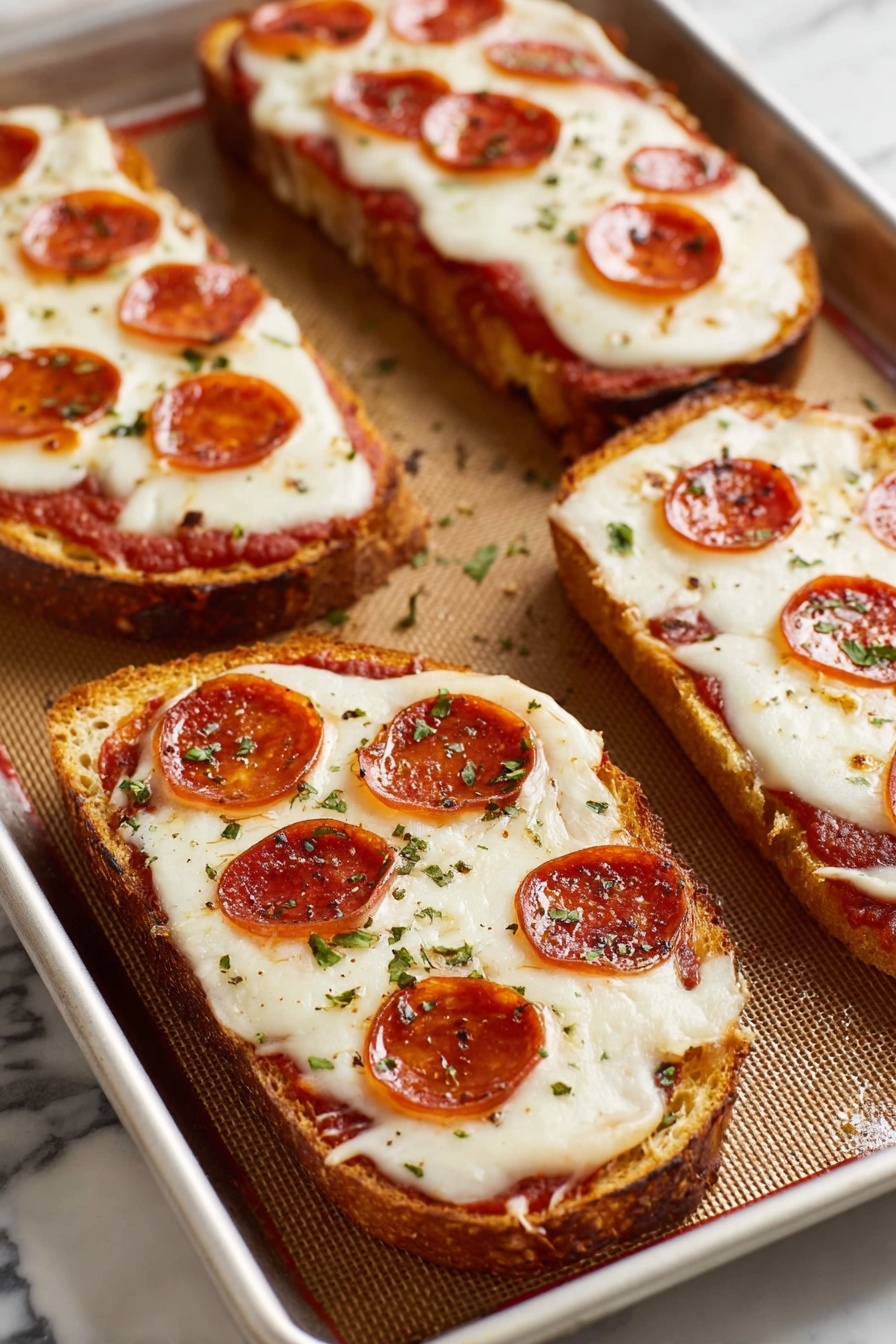Remove the toasted bread from the oven and spread about 1 ½ cups of your favorite pizza sauce evenly over the four slices. Next, generously sprinkle the shredded low-moisture mozzarella cheese—2 ½ cups total—making sure it covers the sauce well for that perfect melty layer. Finally, add 25 pepperoni slices or whatever toppings you love best.