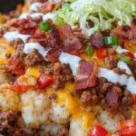 - Repeat Layers: Add the remaining tater tots on top, fitting them closely like puzzle pieces. Spread the remaining beef mixture on top, sprinkle with cooked bacon pieces, and finish with the remaining 1/4 cup cheddar cheese.