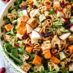 A festive and colorful Christmas Pasta Salad featuring roasted cinnamon-spiced sweet potatoes, holiday-shaped pasta, fresh apples, white cheddar, and a tangy maple balsamic dressing. This salad combines sweet, savory, and tangy flavors perfect for holiday gatherings or chilly winter lunches.