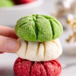 - Dough handling: Transfer dough onto a parchment paper sprinkled with ¼ cup powdered sugar. Divide dough into three equal parts. Make a shallow well in two parts and add red food coloring to one, green food coloring to the other, leaving the third part white.