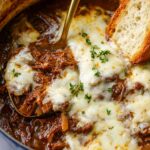This French Onion Pot Roast combines the rich flavors of caramelized onions, tender braised beef, and melted Gruyere cheese for a comforting, hearty dish perfect for dinner. The chuck roast is slowly braised in a flavorful broth with aromatic herbs, white wine, and garlic, then topped with cheese and served with toasted baguette slices or mashed potatoes for a satisfying meal.