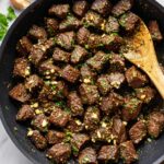 - Combine and Finish: Return the steak bites to the skillet and toss for 1 to 2 minutes, coating them thoroughly in the garlic butter sauce. Remove from heat and stir in the chopped parsley.