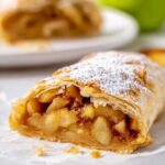 German Apple Strudel (Apfelstrudel) is a classic Austrian dessert featuring thin, flaky strudel dough wrapped around a spiced apple and raisin filling. This traditional recipe includes a buttery breadcrumb layer for added texture and is dusted with powdered sugar for a sweet finish.