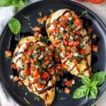 This Easy Bruschetta Chicken recipe features tender grilled chicken breasts seasoned with Italian spices and topped with a fresh tomato basil mixture and melted mozzarella cheese. Finished with a drizzle of balsamic glaze, it’s a quick and flavorful main course perfect for a weeknight dinner.