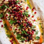 - Assemble and Serve: Spread a thick layer (~0.8 cm) of Creamy Dill Sauce over the salmon surface. Pile the Holiday Tapenade on top, then scatter pomegranate seeds and parsley. Drizzle lemon juice over all. Serve with extra lemon wedges. Cut into portions for serving and encourage guests to enjoy the honey-butter sauce mixed with the creamy dill topping. Best served slightly warm or at room temperature.