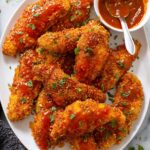 Crispy baked chicken strips coated in a spicy cornflake crust and drizzled with a sweet and spicy hot honey sauce, perfect for a flavorful and easy meal or appetizer.