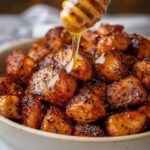 Hot Honey Salmon Bites are flavorful, bite-sized pieces of salmon seasoned with paprika, garlic, and onion powder, then cooked to perfection in an air fryer. They are coated in a deliciously sweet and spicy hot honey glaze and garnished with fresh parsley. Perfect as an appetizer or main course when paired with a side dish. Oven instructions included for those without an air fryer.