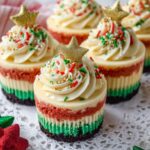 These Mini Christmas Cheesecakes feature a festive marbled red and green cream cheese batter on a crunchy Oreo crust, topped with whipped cream and sprinkles. Perfectly bite-sized and chilled for a creamy, smooth texture, they are an ideal holiday dessert treat.