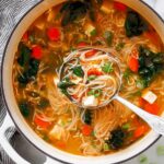 - Finish Soup: Add the thin rice noodles (cut into shorter lengths if desired) and chopped red bell pepper to the pot. Simmer for 2 minutes, then turn off the heat. Add the baby bok choy, shredded chicken, and the dissolved miso mixture. Cover the pot and let it sit for 1-2 minutes until the noodles are al dente and the bok choy is wilted. Do not boil or simmer the soup after adding the miso, as it will affect the texture.
