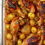 A flavorful and easy one-pan chicken and potatoes recipe featuring tender chicken thighs and drumsticks roasted with garlic, lemon, oregano, and paprika for a deliciously crispy and juicy meal perfect for any weeknight dinner.