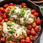 This Pesto Baked Chicken with Tomatoes is a flavorful, easy-to-make dish featuring tender chicken breasts marinated in a zesty pesto and balsamic vinegar mixture, baked alongside a vibrant medley of cherry tomatoes, shallots, and mozzarella cheese. Garnished with fresh basil, it makes a perfect healthy and delicious main course for weeknight dinners or special occasions.
