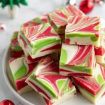 This festive Christmas fudge is a creamy and colorful treat made with white chocolate, sweetened condensed milk, and butter, swirled with vibrant red and green gel food coloring to celebrate the holiday season. It's rich, smooth, and perfect for sharing or gifting during Christmas.