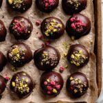 Delight in these luscious Raspberry Dark Chocolate Truffles featuring a smooth white chocolate ganache infused with vibrant freeze dried raspberry powder, coated in rich dark chocolate, and finished with decorative cacao nibs, pistachios, or raspberries. Perfect for gifting or indulgent snacking.
