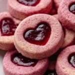 Delight in these charming Raspberry Heart Thumbprint Cookies, featuring a buttery, tender dough infused with freeze-dried raspberry powder and filled with luscious raspberry jam. Perfectly shaped with a sweet heart indentation, these cookies bake to a golden bottom while remaining soft on top, setting beautifully as they cool for an irresistible treat.