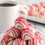 Delightful Red Velvet Cheesecake Bites combining rich cream cheese with classic red velvet cake mix, coated in white almond bark and garnished with red candy melt stripes. Perfect for sweet gatherings or holiday treats.